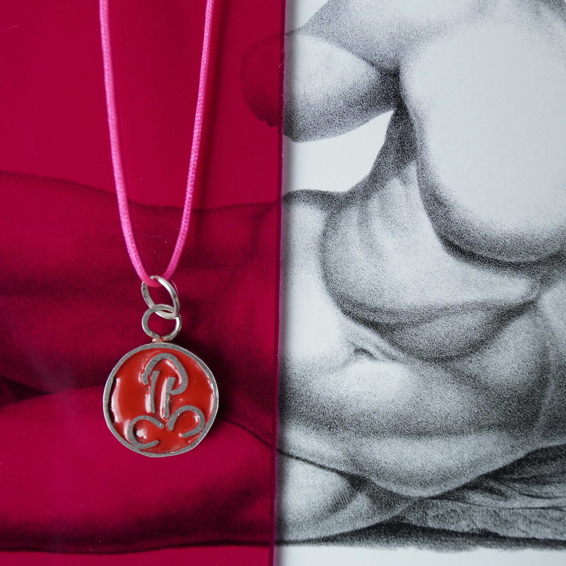 Dije con silueta de pene fabricado en plata 950 con esmalte de baja temperatura y cadena de plata 925 de 45 cms.