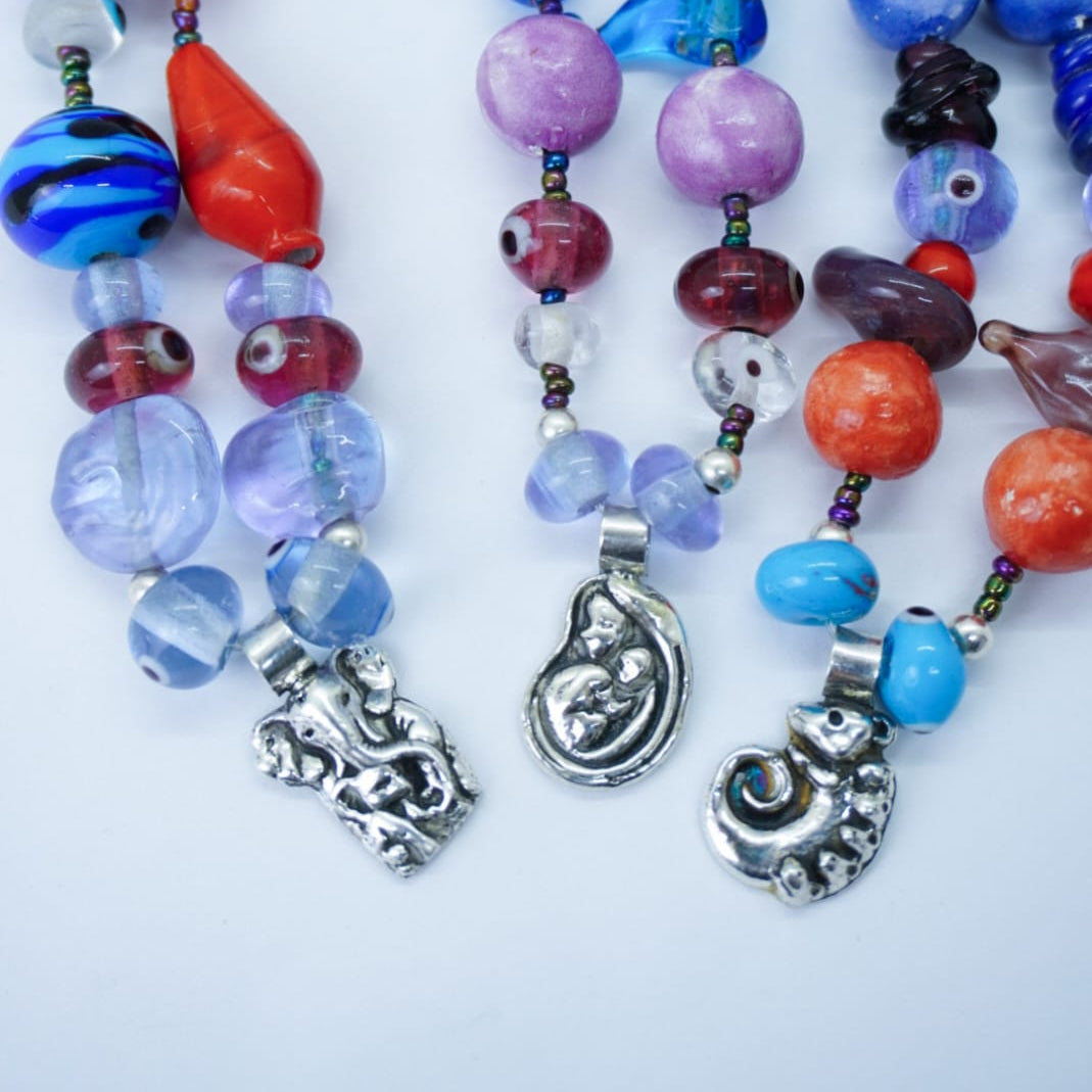 Dije de 18 mm de plata 925 con mullos de vidrio y cerámica fabricados a mano en nuestro taller. El collar mide 50 cms de largo, puedes personalizar los colores de los mullos.